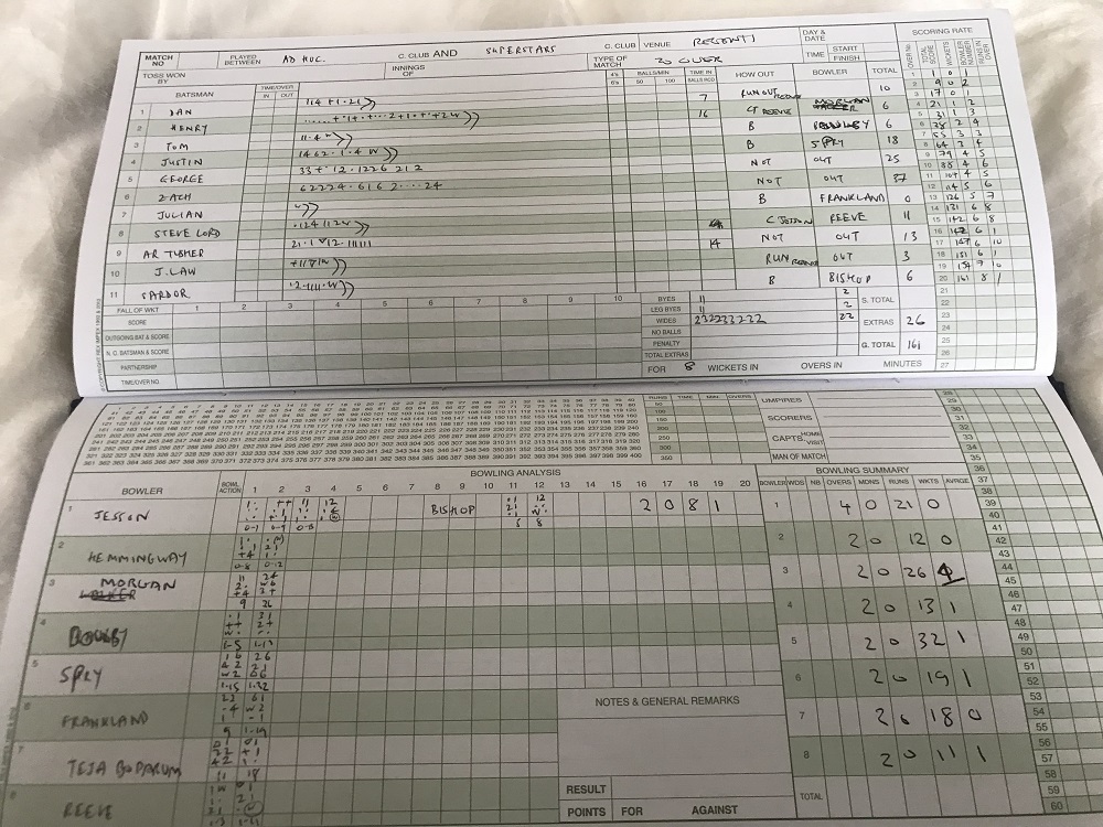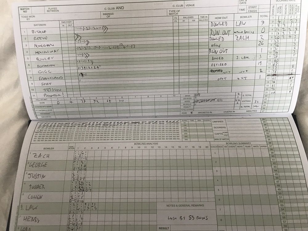 Ten plaers but nine players bowled and nine goals batted and it's all good fun really. |