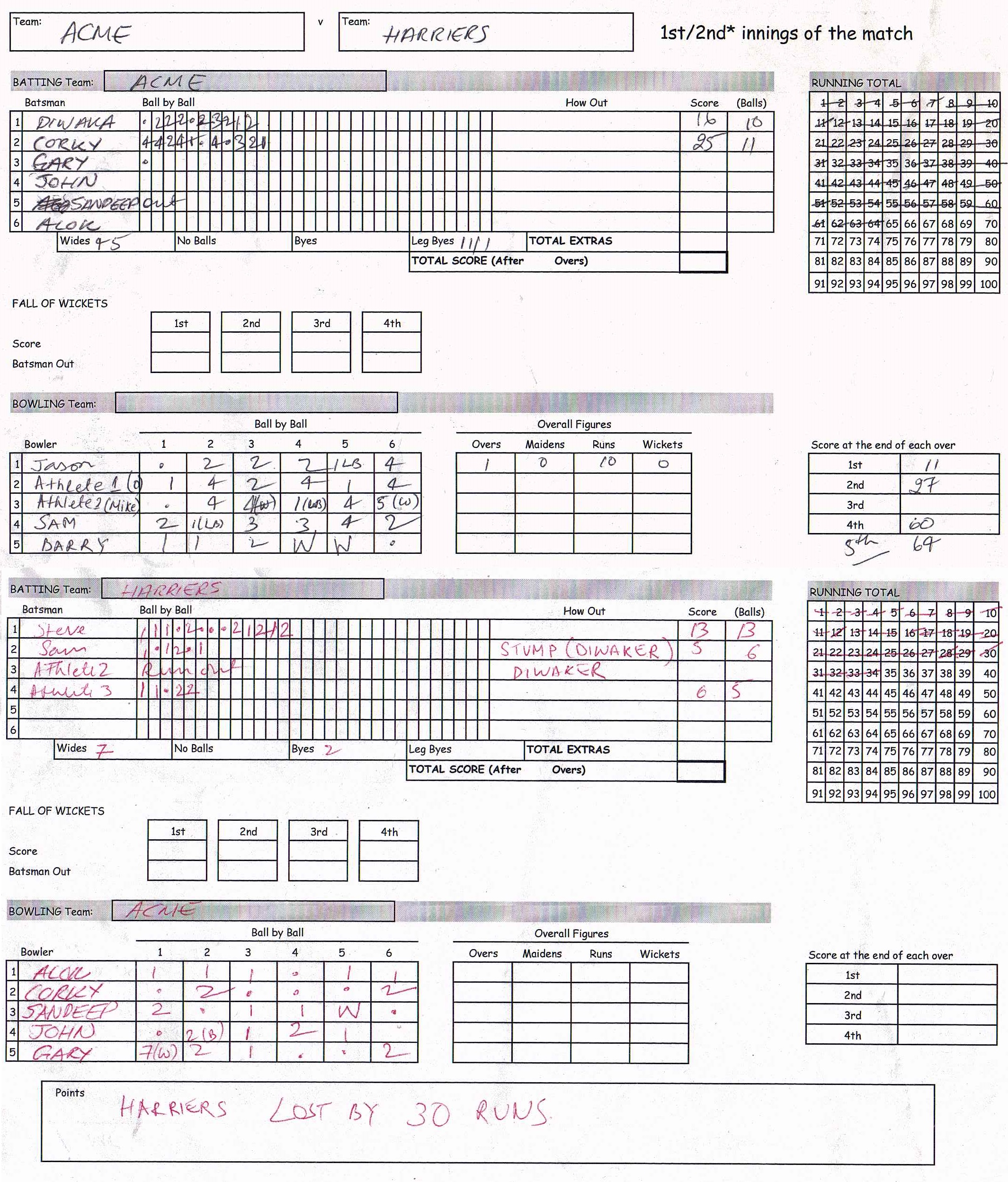 ACME (120 points) beat HARRIERS (5 points) by 30 runs |