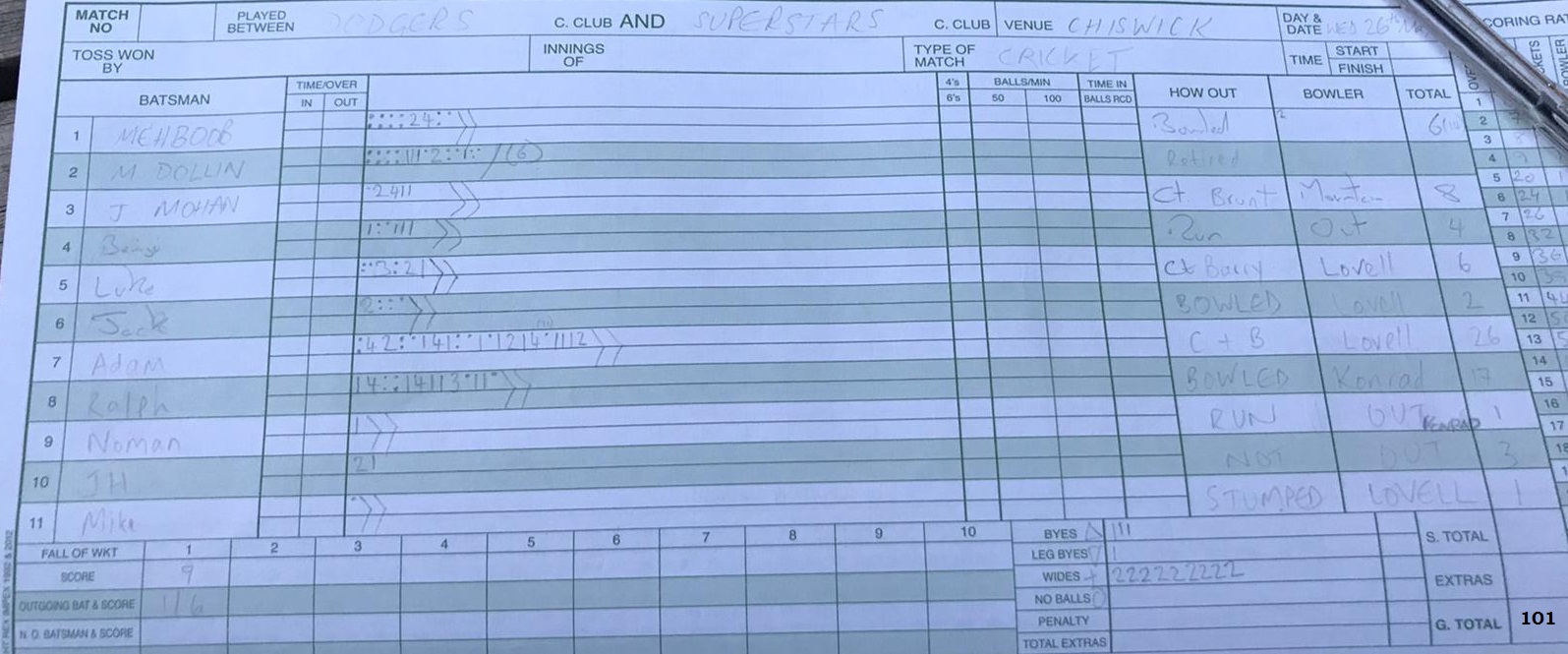 calmly blocked by incoming Dodger Adam (26). He, Ralph (17) and our old friend Extras (22) boosted the total to 101, at the expense of