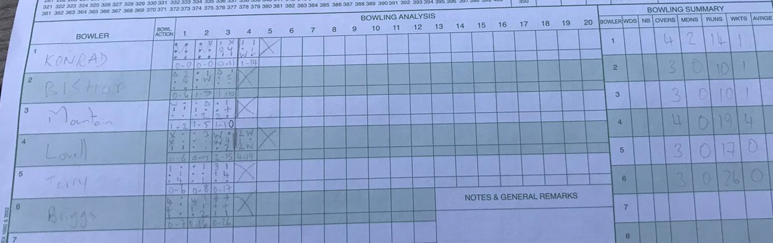 the third ball; bringing John Bishop onto strike. He clipped the fourth for 2 but failed to connect with the fifth; a bye was