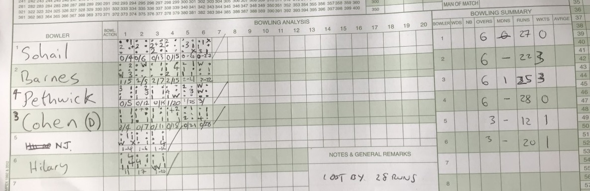 Merv wrote that small WhatsApp message. In the end we reached 139-8, losing by 28 runs. |
