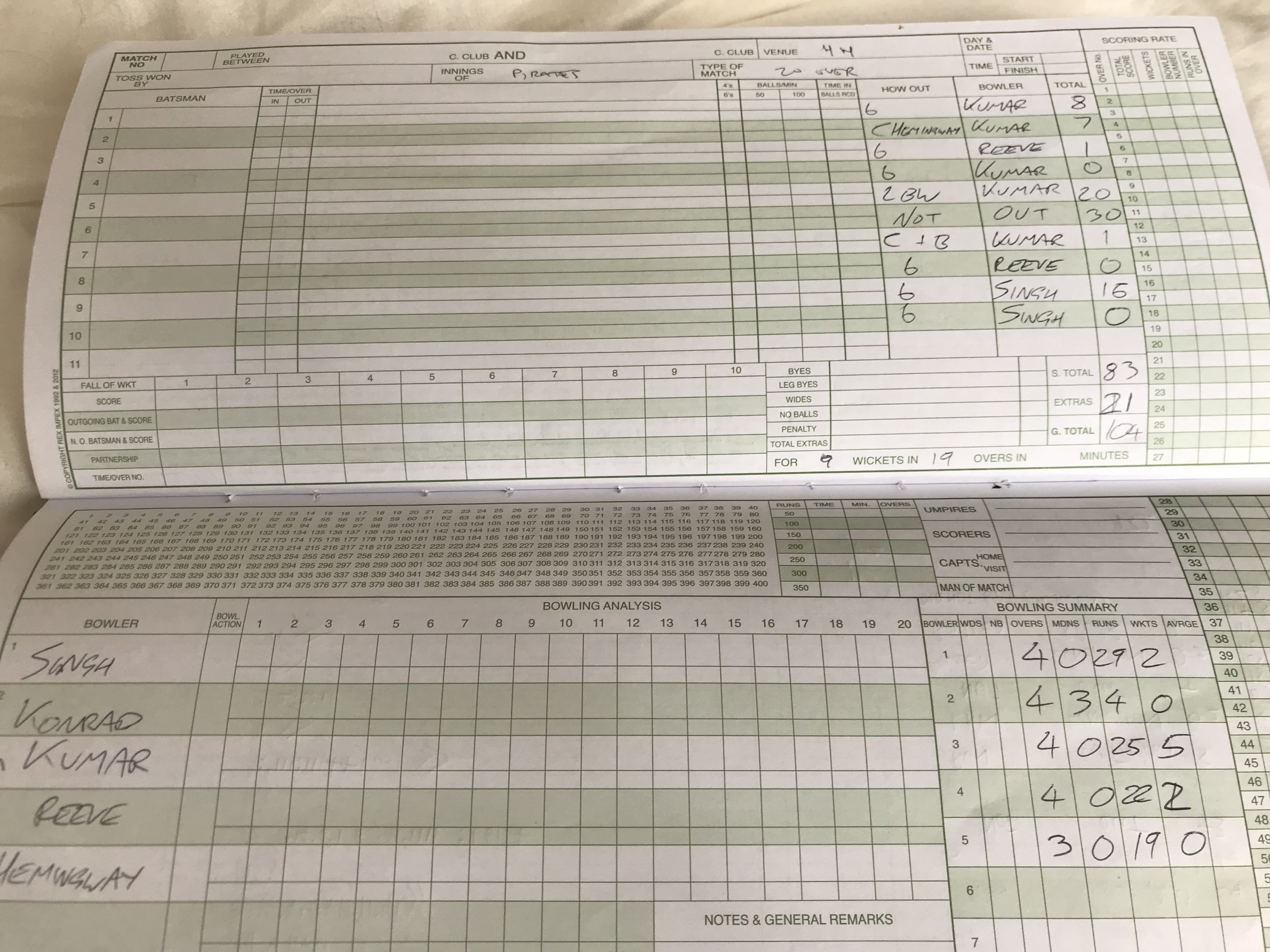 we slumped to 35-5 but Harish (19) and Alok (22) got us up to 120-8 at the close. In reply Harish took a