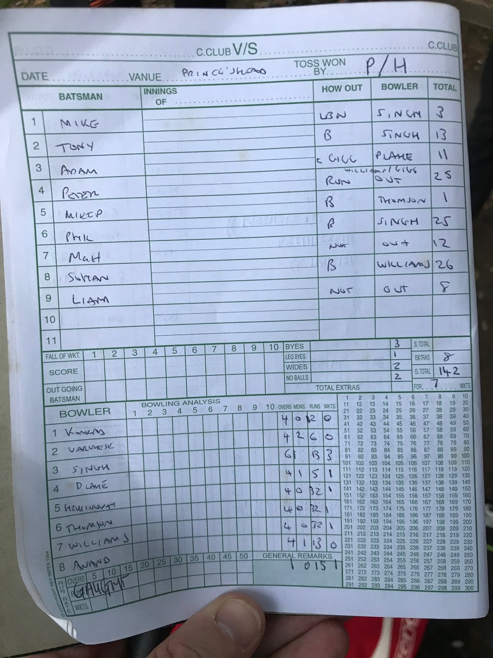 KCZ and Varghese elicited very few opposition runs (but unusually no wickets), Singh struck first ball,