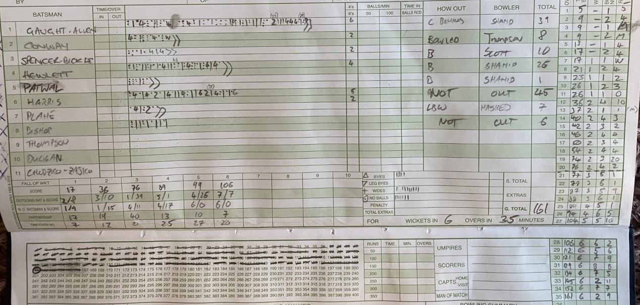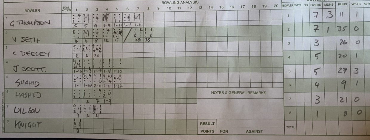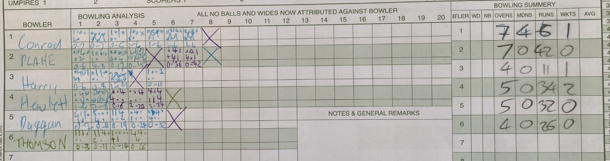 we needed have bothered as it was clear the overs were maidens. Konrad bowled 7 overs "off the reel"