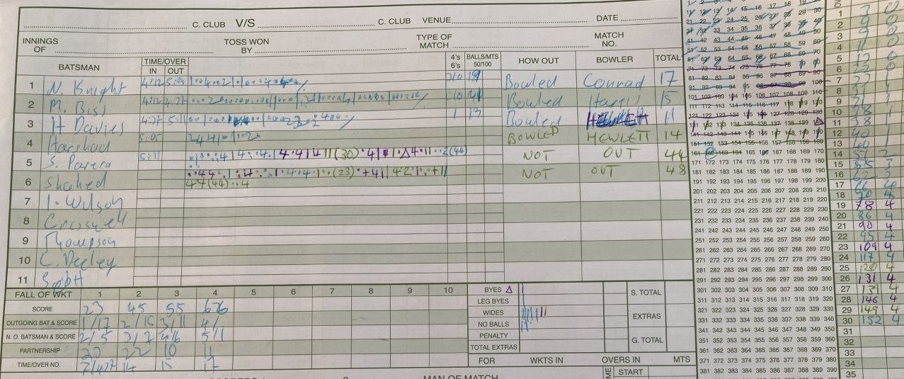 from Aaron Harris, supported by John "the Arch" Bishop. In a partnership of 55 runs JB scored 6 but sensibly