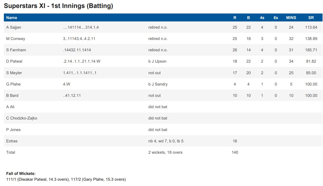 A strong start by Sajjan (25 retd.), Conway (25 Retd.) and Farnham (26 retd.) saw Superstars on 79 at the halfway point. Patwal (18) Meyler (17 n.o.) Plahe (4) and Bard (10 n.o) could not quite keep the rate up on the second half. Steve Meyler’s comedy attempts at a reverse sweep off Duggan (2-0-9-0) gifted him 2 dot balls. In any case, 140-2 looked like a strong total. |