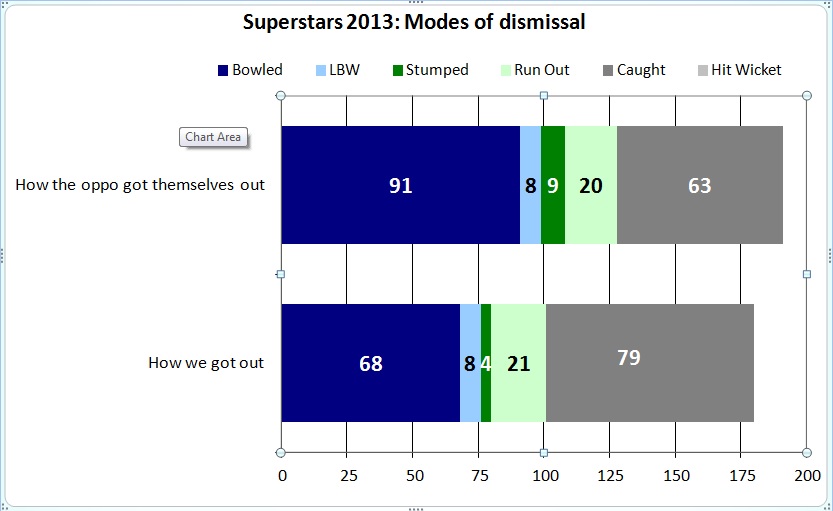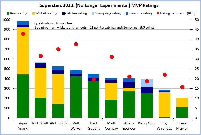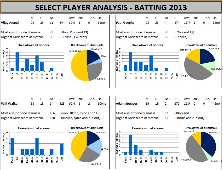 Click on the charts to see larger versions. The first shows the distribution of dismissals, the Most Valuable Player Ratings and
