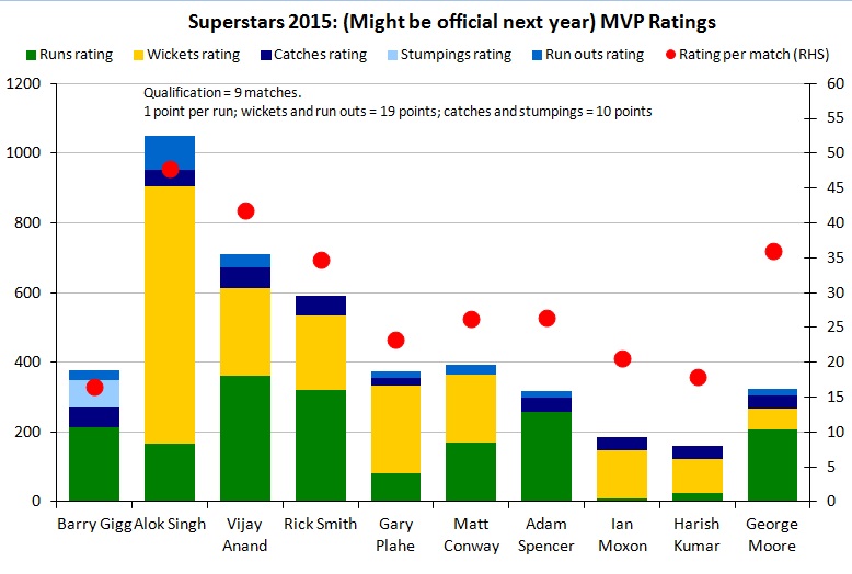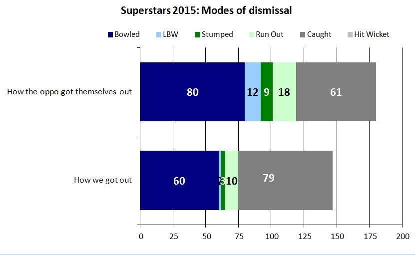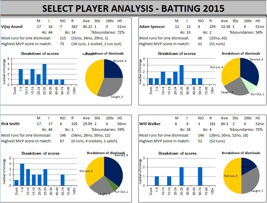 Click on the charts to see larger versions. They show the distribution of dismissals, the Most Valuable Player Ratings and