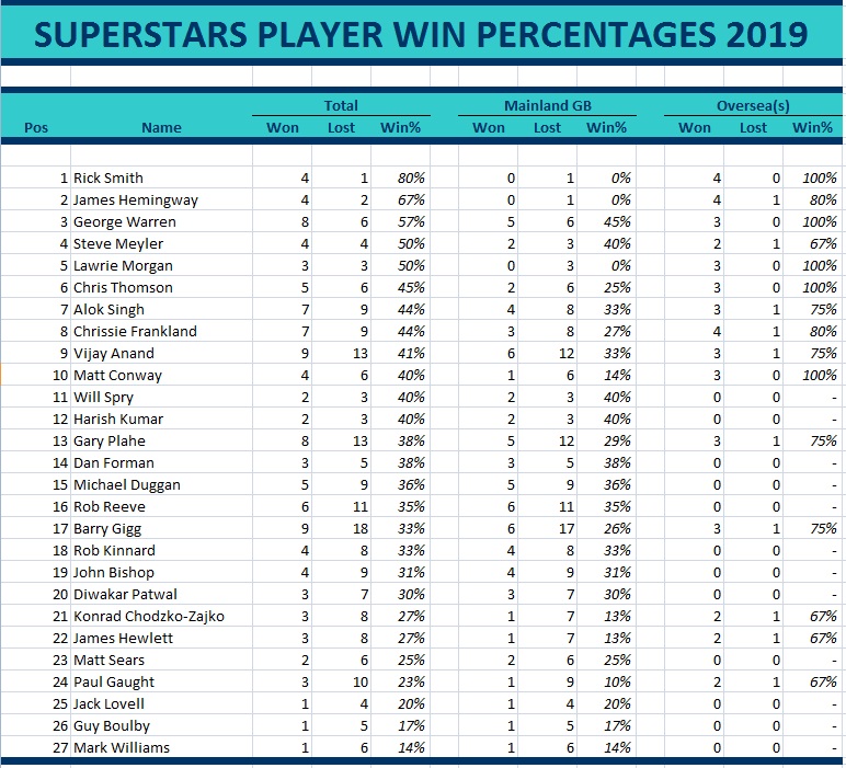on Mainland GB. The three players with an overall positive record were Rick Smith (1 match on Mainland GB),